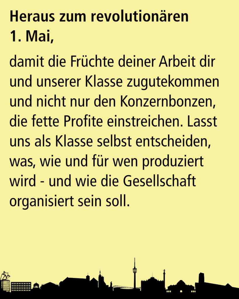 27/04/2025damit die Früchte deiner Arbeit dir und unserer Klasse zugutekommen und nicht nur den Konzernbonzen, die fette Profite einstreichen. Lasst uns als Klasse selbst entscheiden, was, wie und für wen produziert wird – und wie die Gesellschaft organisiert sein soll.