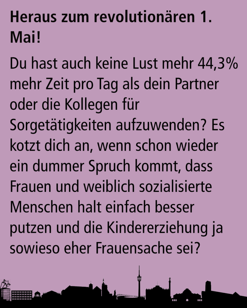 Dann komm mit uns am 1. Mai auf die Straße, denn die geschlechtsspezifische Aufteilung von unbezahlter Haus- und Sorgearbeit, ist nicht vom Himmel gefallen. Sie hat strukturelle Gründe, die tief in unserer patriarchalen und kapitalistischen Gesellschaft verwurzelt sind.