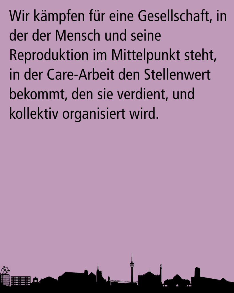 Wir kämpfen für eine Gesellschaft, in der der Mensch und seine Reproduktion im Mittelpunkt steht, in der Care-Arbeit den Stellenwert bekommt, den sie verdient, und kollektiv organisiert wird.