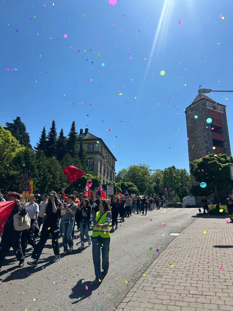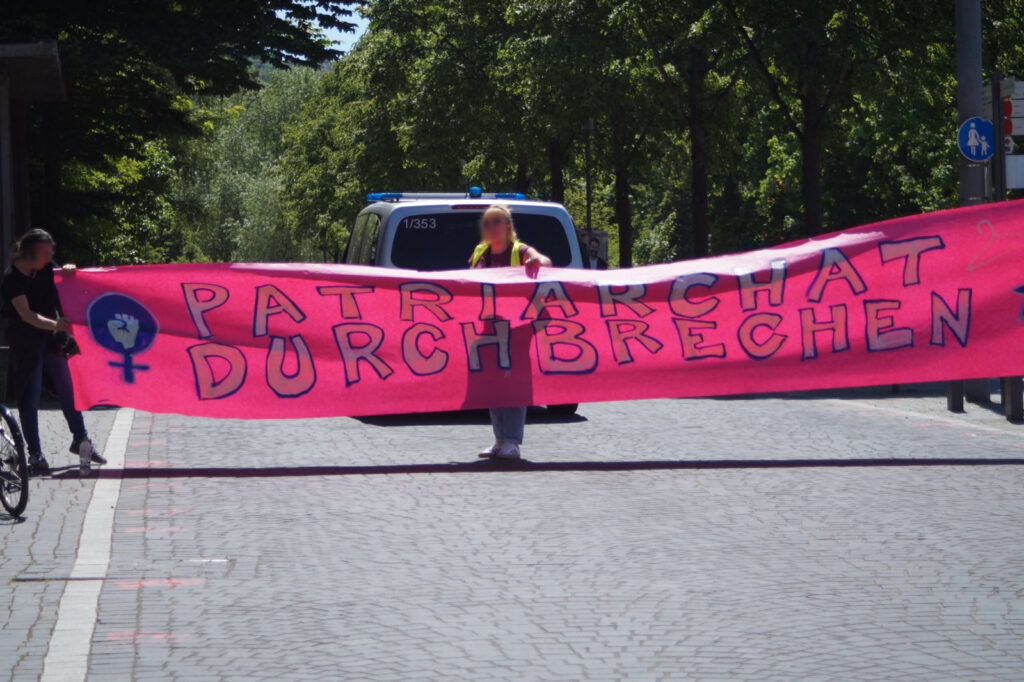 Es folgte unsere gemeinsame Demonstration durch die Gmünder Innenstadt: Bei Sonnenschein und guter Stimmung wurde lautstark darauf aufmerksam gemacht, dass wir mit dem zeitgleich stattfindenden Kongress der „Lebensschützer“ und ihrem antiquierten, christlich-rechten Weltbild nicht einverstanden sind. Hierzu wurden Parolen gerufen wie: „Kinder oder keine, entscheiden wir alleine!“, „I raise my fist and I raise my voice – my body, my choice!“ oder auch „Frauen, die kämpfen, sind Frauen, die leben“. In der Remsstraße durchbrach der Demonstrationszug mit lautem Jubel ein Papierbanner mit der Aufschrift „Patriarchat durchbrechen“ – ein kraftvolles Zeichen gegen patriarchale Strukturen!