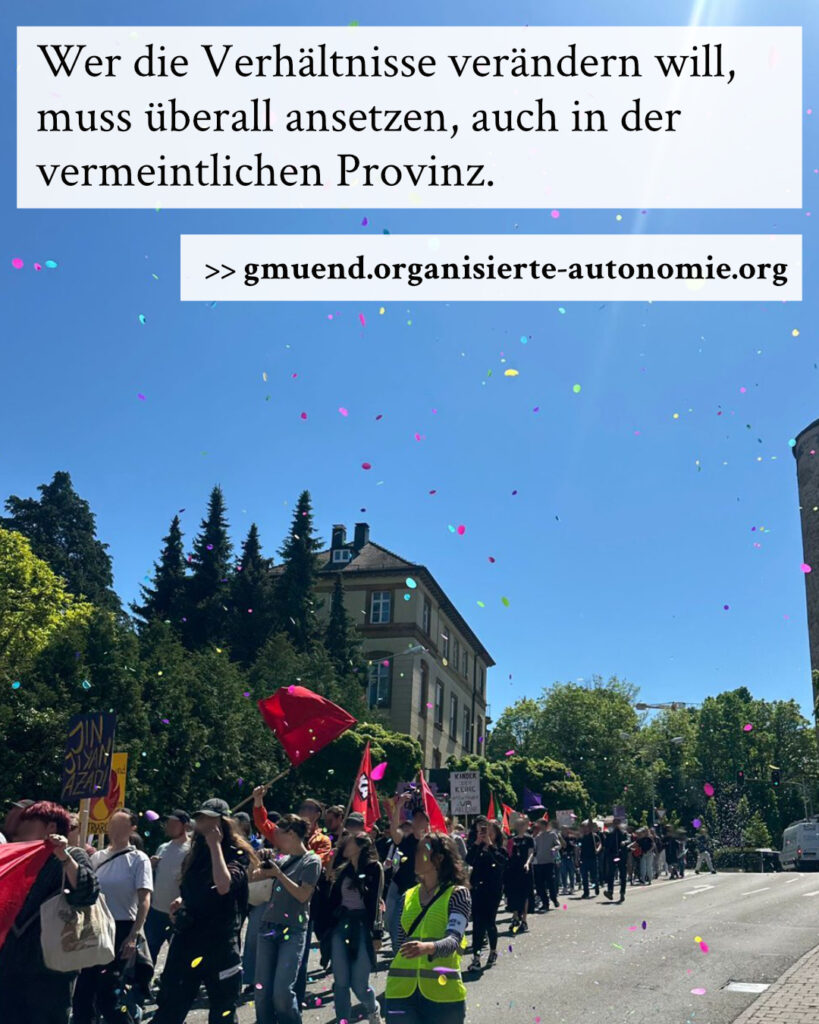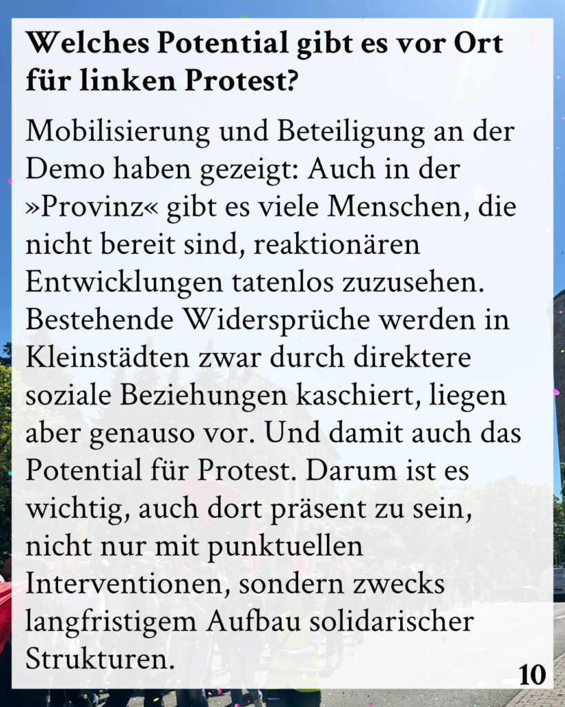 Mobilisierung und Beteiligung an der Demo haben gezeigt: Auch in der »Provinz« gibt es viele Menschen, die nicht bereit sind, reaktionären Entwicklungen tatenlos zuzusehen. Bestehende Widersprüche werden in Kleinstädten zwar durch direktere soziale Beziehungen kaschiert, liegen aber genauso vor. Und damit auch das Potential für Protest. Darum ist es wichtig, auch dort präsent zu sein, nicht nur mit punktuellen Interventionen, sondern zwecks langfristigem Aufbau solidarischer Strukturen.