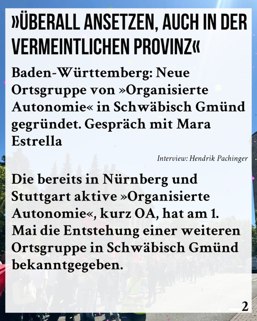 Die bereits in Nürnberg und Stuttgart aktive »Organisierte Autonomie«, kurz OA, hat am 1. Mai die Entstehung einer weiteren Ortsgruppe in Schwäbisch Gmünd bekanntgegeben.