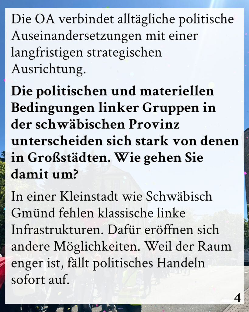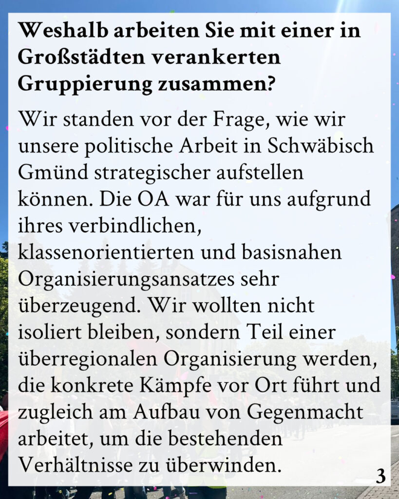 Wir standen vor der Frage, wie wir unsere politische Arbeit in Schwäbisch Gmünd strategischer aufstellen können. Die OA war für uns aufgrund ihres verbindlichen, klassenorientierten und basisnahen Organisierungsansatzes sehr überzeugend. Wir wollten nicht isoliert bleiben, sondern Teil einer überregionalen Organisierung werden, die konkrete Kämpfe vor Ort führt und zugleich am Aufbau von Gegenmacht arbeitet, um die bestehenden Verhältnisse zu überwinden.