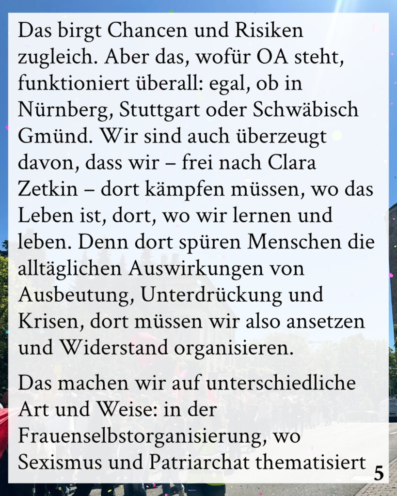 Das birgt Chancen und Risiken zugleich. Aber das, wofür OA steht, funktioniert überall: egal, ob in Nürnberg, Stuttgart oder Schwäbisch Gmünd. Wir sind auch überzeugt davon, dass wir – frei nach Clara Zetkin – dort kämpfen müssen, wo das Leben ist, dort, wo wir lernen und leben. Denn dort spüren Menschen die alltäglichen Auswirkungen von Ausbeutung, Unterdrückung und Krisen, dort müssen wir also ansetzen und Widerstand organisieren.