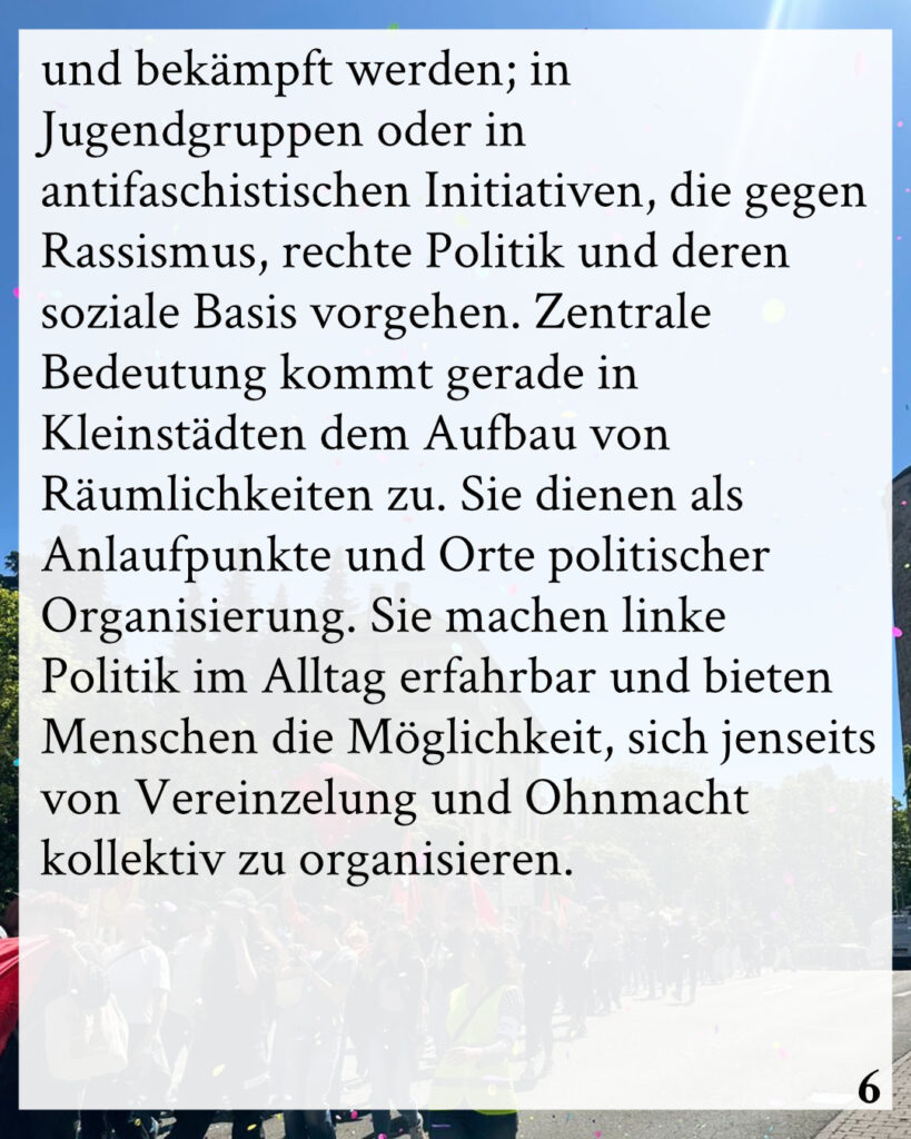Das machen wir auf unterschiedliche Art und Weise: in der Frauenselbstorganisierung, wo Sexismus und Patriarchat thematisiert und bekämpft werden; in Jugendgruppen oder in antifaschistischen Initiativen, die gegen Rassismus, rechte Politik und deren soziale Basis vorgehen. Zentrale Bedeutung kommt gerade in Kleinstädten dem Aufbau von Räumlichkeiten zu. Sie dienen als Anlaufpunkte und Orte politischer Organisierung. Sie machen linke Politik im Alltag erfahrbar und bieten Menschen die Möglichkeit, sich jenseits von Vereinzelung und Ohnmacht kollektiv zu organisieren.