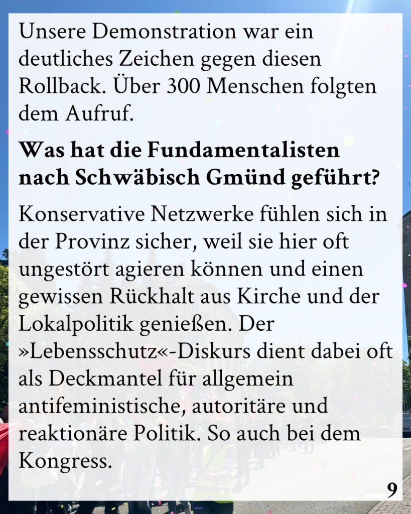 Wir und vor allem die Fraueninitiative Schwäbisch Gmünd wollten sichtbar machen, dass antifeministische und reaktionäre Ideologien hier keinen Platz haben. Der sogenannte »Leben.Würde«-Kongress brachte christlich-fundamentalistische und rechtskonservative Akteure zusammen, die Selbstbestimmung gezielt angreifen.