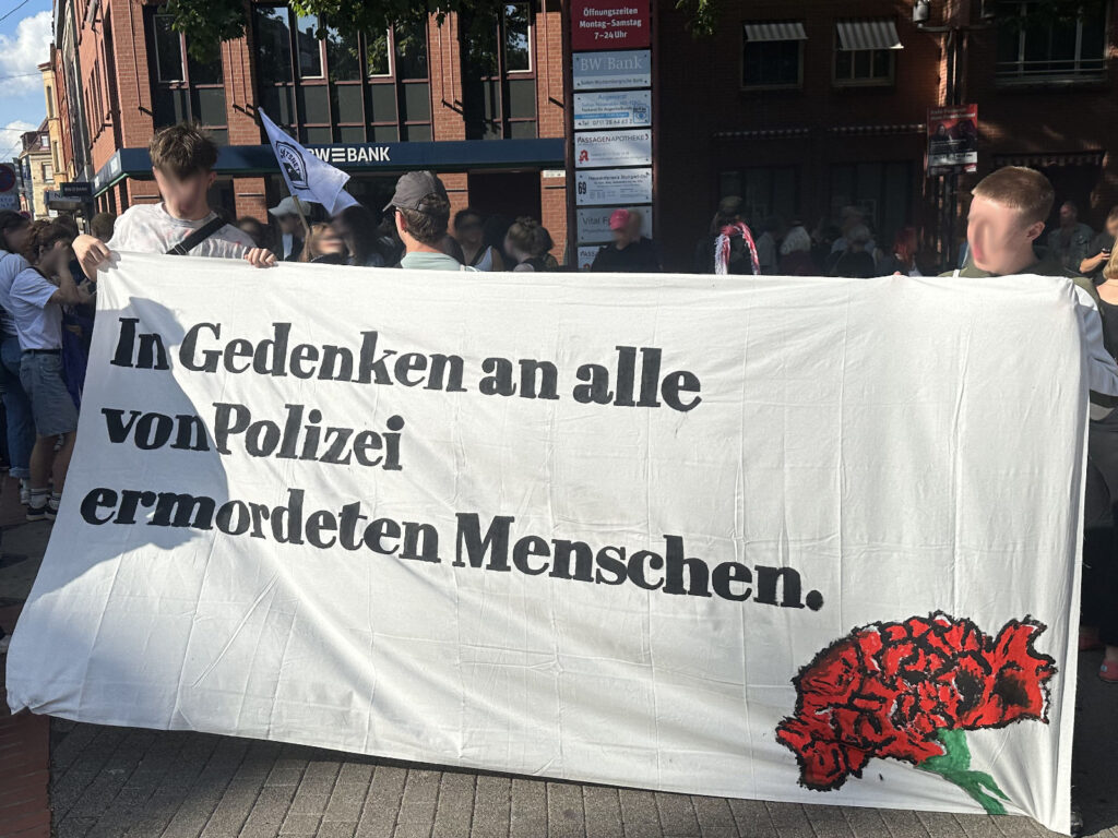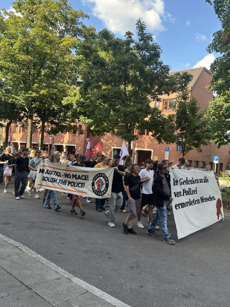 Am 18. Juli zogen daher über 200 Menschen unter dem Motto „Strobl spricht – Polizist schießt“ durch die Stuttgarter Innenstadt, um ihre Wut, ihre Trauer und ihren Widerstand sichtbar zu machen. Die Auftaktkundgebung auf dem Rotebühlplatz wurde von verschiedenen Gruppen getragen: Das AABS sprach über den gesellschaftlichen Rechtsruck, das BRIKS-Bündnis thematisierte die Militarisierung nach innen und außen und die Seebrücke beleuchtete die Perspektive von Flucht und Migration.