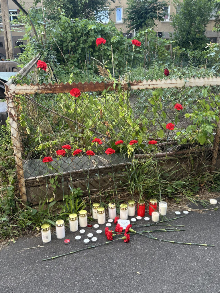Bereits am 11. Juli versammelten wir uns mit weiteren ca. 100 Menschen in Stuttgart-Ost, um dem Ermordeten zu gedenken. Nach einer einordnenden Rede auf dem Ostendplatz vor einem Supermarkt zogen wir still über die Ostendstraße zu dem Tatort. Dort angekommen legten die Teilnehmenden Blumen und Kerzen an dem Ort nieder, an dem der junge Mann sich zunächst vor der Polizei versteckt hatte und wenig später von ihr erschossen wurde.
