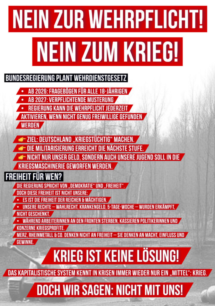 Das Ziel ist klar: Deutschland kriegstüchtig machen. Die Militarisierung erreicht eine neue Stufe. Ab jetzt soll nicht mehr nur unser Geld, sondern auch die Jugend in die Kriegsmaschinerie geworfen werden. Das alles unter dem Vorwand, Demokratie und Freiheit zu verteidigen.