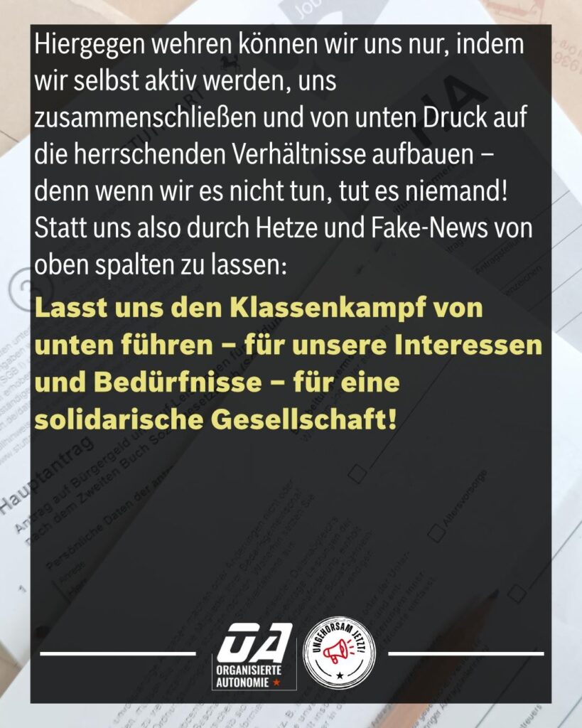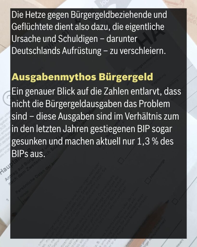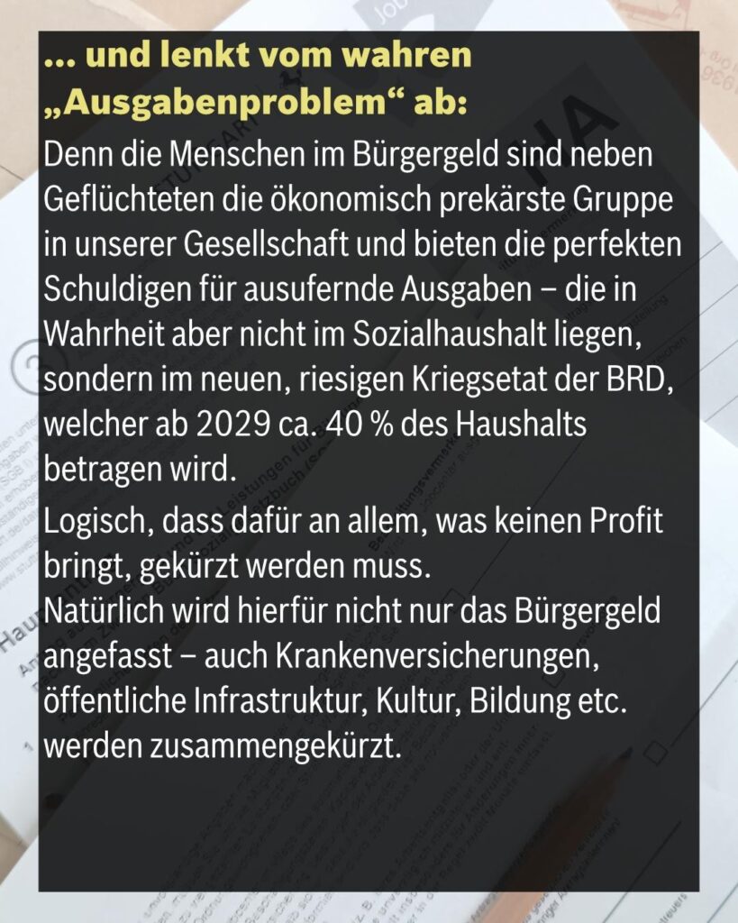 Denn die Menschen im Bürgergeld sind neben Geflüchteten die ökonomisch prekärste Gruppe in unserer Gesellschaft und bieten die perfekten Schuldigen für ausufernde Ausgaben – die in Wahrheit aber nicht im Sozialhaushalt liegen, sondern im neuen, riesigen Kriegsetat der BRD, welcher ab 2029 ca. 40 % des Haushalts betragen wird. Logisch, dass dafür an allem, was keinen Profit bringt, gekürzt werden muss. Natürlich wird hierfür nicht nur das Bürgergeld angefasst – auch Krankenversicherungen, öffentliche Infrastruktur, Kultur, Bildung etc. werden zusammengekürzt. Die Hetze gegen Bürgergeldbeziehende und Geflüchtete dient also dazu, die eigentliche Ursache und Schuldigen – darunter Deutschlands Aufrüstung – zu verschleiern.