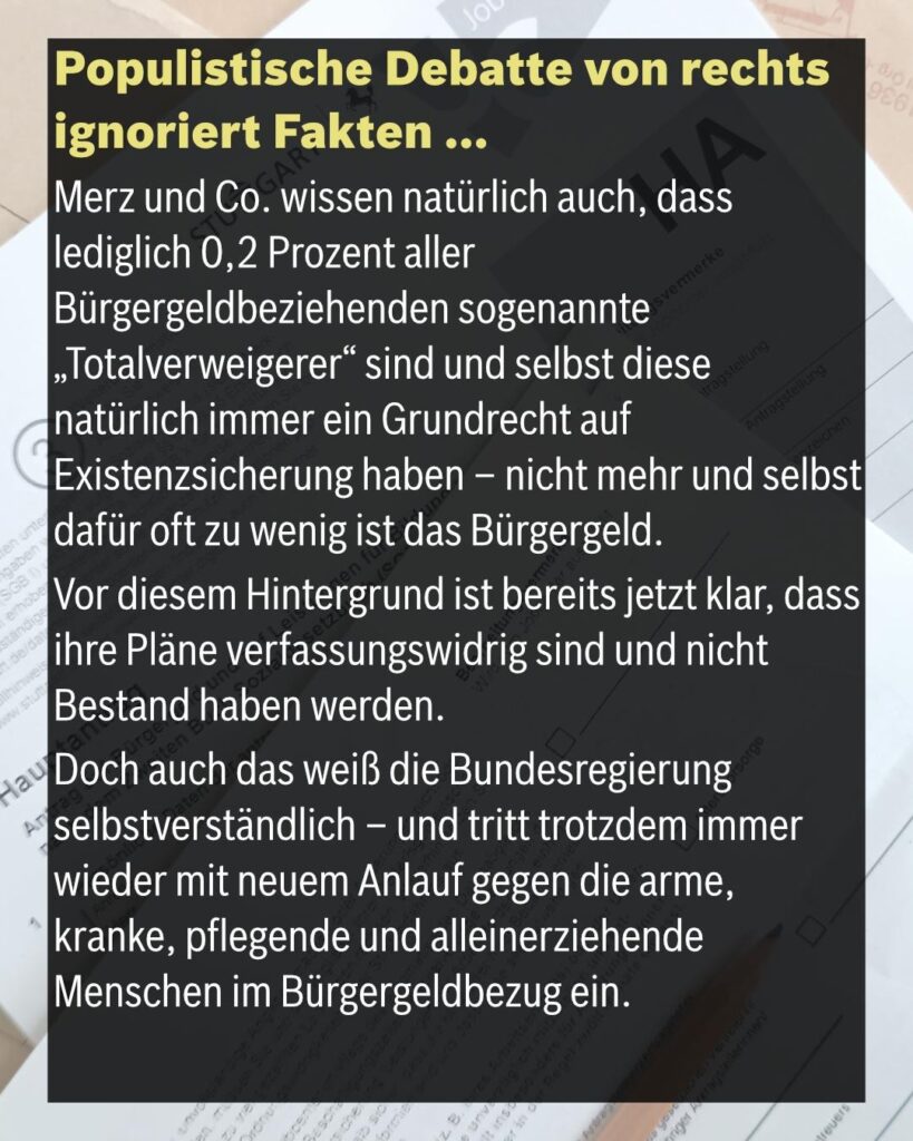 Merz und Co. wissen zu gut, dass lediglich 0,2 Prozent aller Bürgergeldbeziehenden sogenannte „Totalverweigerer“ sind und selbst diese natürlich immer ein Grundrecht auf Existenzsicherung haben – nicht mehr und selbst dafür oft zu wenig ist das Bürgergeld. Vor diesem Hintergrund ist bereits jetzt klar, dass ihre Pläne verfassungswidrig sind und nicht Bestand haben werden. Doch auch das weiß die Bundesregierung selbstverständlich – und tritt trotzdem immer wieder mit neuem Anlauf gegen die armen, kranken, pflegenden und alleinerziehenden Menschen im Bürgergeldbezug ein.