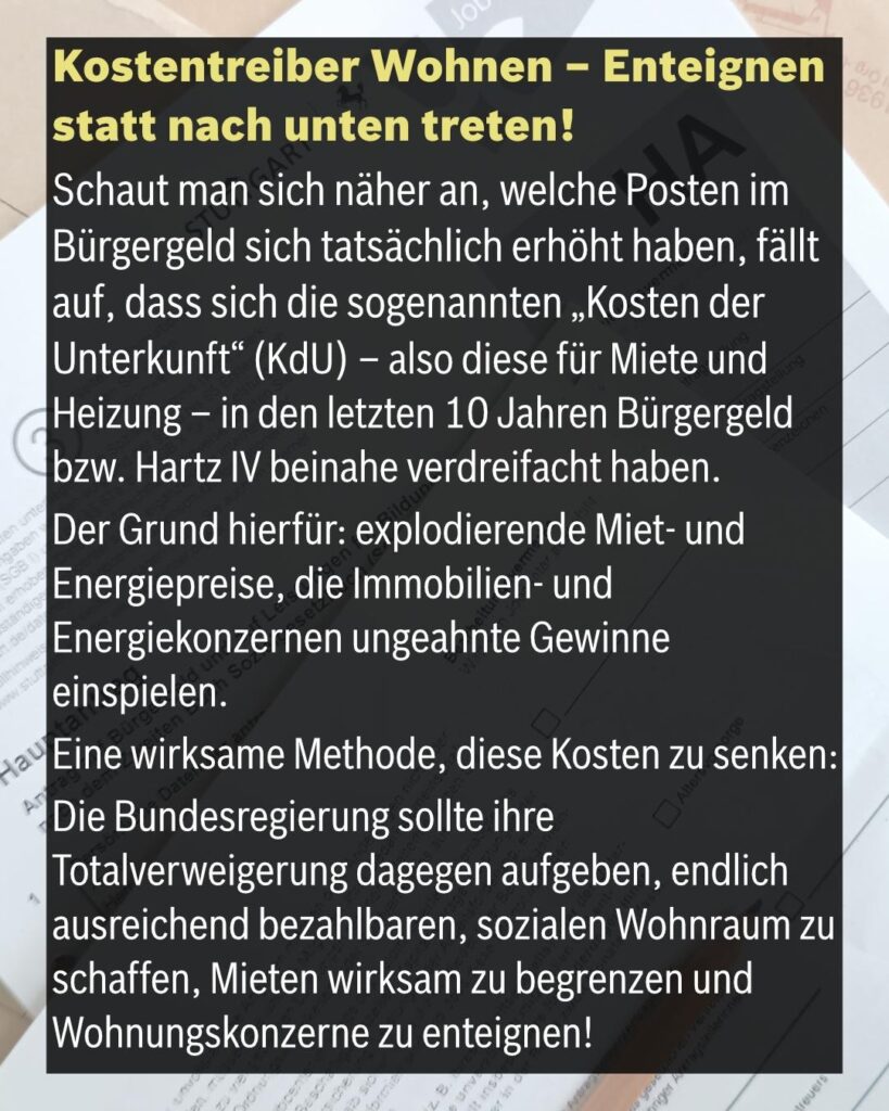 Schaut man sich näher an, welche Posten im Bürgergeld sich tatsächlich erhöht haben, fällt auf, dass sich die sogenannten „Kosten der Unterkunft“ (KdU) – also diese für Miete und Heizung – in den letzten 10 Jahren Bürgergeld bzw. Hartz IV beinahe verdreifacht haben. Der Grund hierfür: explodierende Miet- und Energiepreise, die Immobilien- und Energiekonzernen ungeahnte Gewinne einspielen. Eine wirksame Methode, diese Kosten zu senken: Die Bundesregierung sollte ihre Totalverweigerung dagegen aufgeben, endlich ausreichend bezahlbaren, sozialen Wohnraum zu schaffen, Mieten wirksam zu begrenzen und Wohnungskonzerne zu enteignen! Dass das nicht geschieht, zeigt einmal mehr auf, dass die Profite der Vermögenden wichtiger sind als menschliche Grundrechte wie das auf Nahrung, Gesundheit und eine warme Wohnung.
