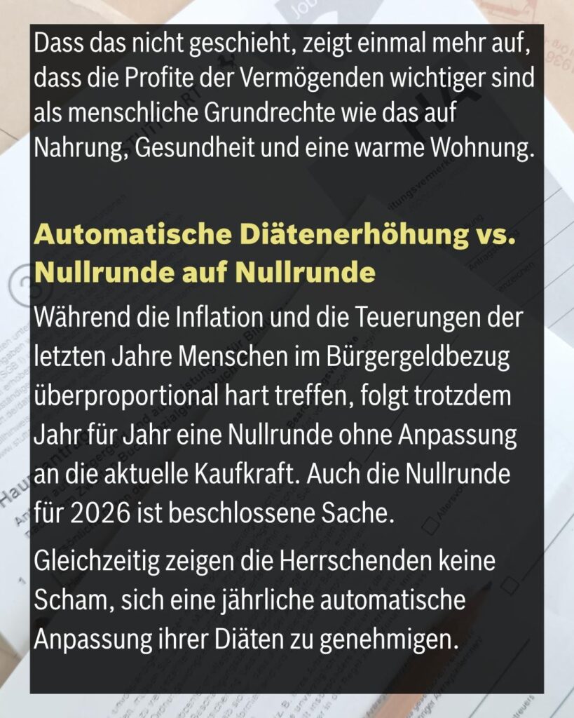 Während die Inflation und die Teuerungen der letzten Jahre Menschen im Bürgergeldbezug überproportional hart treffen, folgt trotzdem Jahr für Jahr eine Nullrunde ohne Anpassung an die aktuelle Kaufkraft. Auch die Nullrunde für 2026 ist beschlossene Sache.