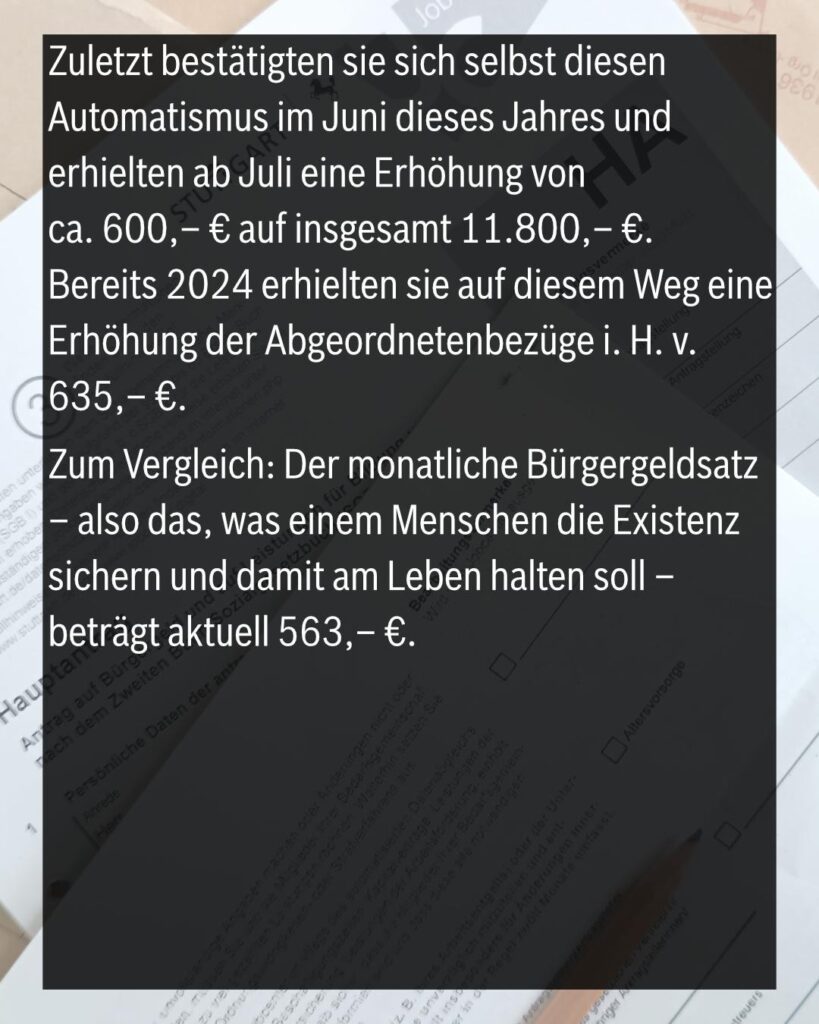 Gleichzeitig zeigen die Herrschenden keine Scham, sich eine jährliche automatische Anpassung ihrer Diäten zu genehmigen. Zuletzt bestätigten sie sich selbst diesen Automatismus im Juni dieses Jahres und erhielten ab Juli eine Erhöhung von ca. 600,– € auf insgesamt über 11.800,– €. Bereits 2024 erhielten sie auf diesem Weg eine Erhöhung der Abgeordnetenbezüge i. H. v. 635,– €.
