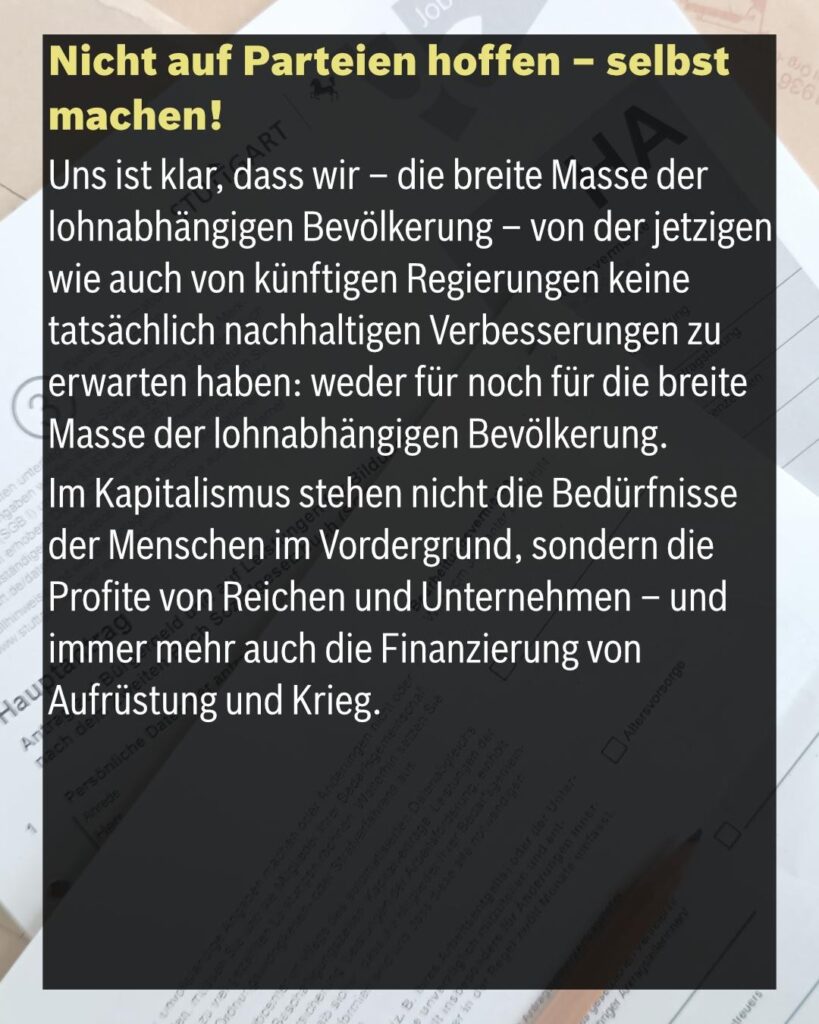 Uns ist klar, dass wir – die breite Masse der lohnabhängigen Bevölkerung – von der jetzigen wie auch von künftigen Regierungen keine tatsächlich nachhaltigen Verbesserungen zu erwarten haben: weder für noch für die breite Masse der lohnabhängigen Bevölkerung.