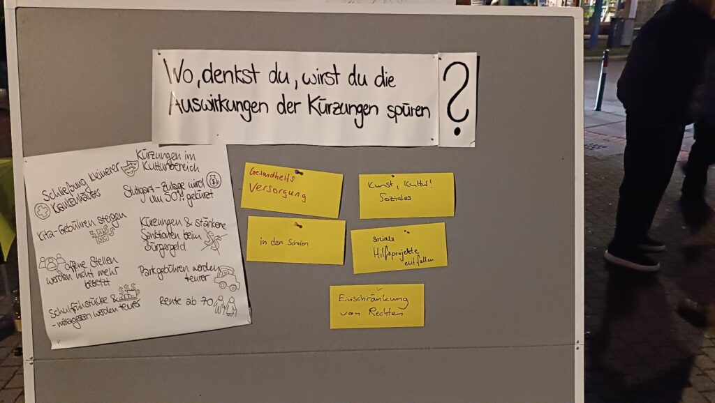 Dem Aufruf folgten einige Menschen, und während der Kundgebung blieben viele Passant*innen stehen, informierten sich und suchten das Gespräch. Vor allem die Themen Krieg sowie die kommunalen Kürzungen und ihre Folgen wurden häufig angesprochen und diskutiert. Das zeigte sich auch auf unseren Wandtafeln, auf denen wir gefragt hatten, wo die Auswirkungen der Kürzungen besonders spürbar sein werden und wofür das Geld stattdessen eingesetzt werden sollte.