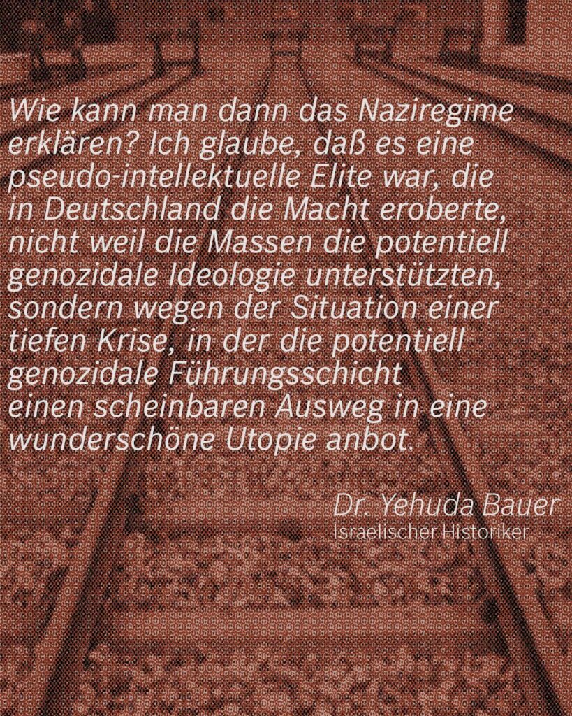 15/01/2026„Wie kann man dann das Naziregime erklären? Ich glaube, daß es eine pseudo-intellektuelle Elite war, die in Deutschland die Macht eroberte, nicht weil die Massen die potentiell genozidale Ideologie unterstützten, sondern wegen der Situation einer tiefen Krise, in der die potentiell genozidale Führungsschicht einen scheinbaren Ausweg in eine wunderschöne Utopie anbot.“ – Dr. Yehuda Bauer, Israelischer Historiker