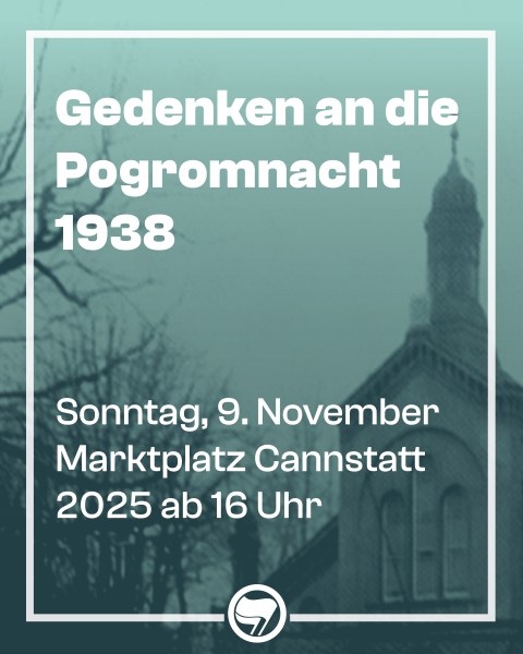 Sonntag, 9. November 2025 ab 16.00 Uhr auf dem Cannstatter Marktplatz und anschließend Demonstration zum Platz der ehemaligen Synagoge –…